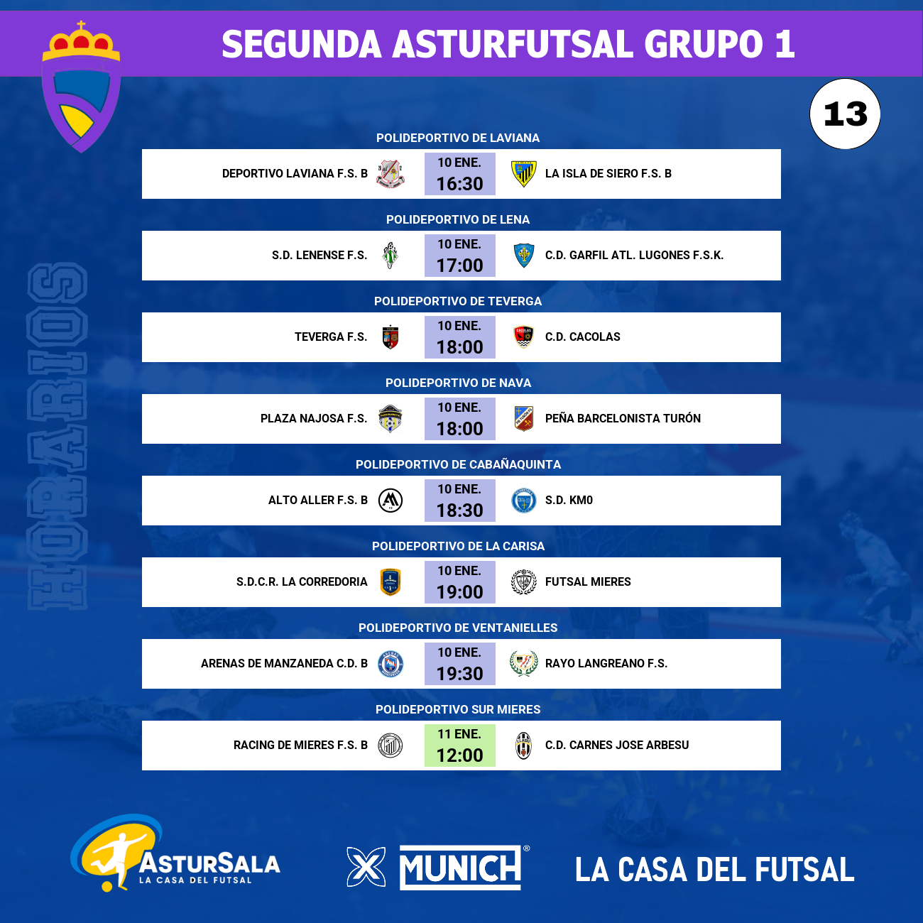 El balón vuelve a rodar en el Grupo 1 de la Segunda Asturfutsal. Tras las vacaciones de Navidad, los equipos afrontan la Jornada 13 con las baterías recargadas y la calculadora en la mano. La lucha por las dos plazas de ascenso directo se encuentra al rojo vivo. Con el Teverga F.S. comandando la tabla (28 puntos), el foco de atención recae sobre sus perseguidores inmediatos. El segundo clasificado, Lugones Rangers B (24 puntos), cumple su jornada de descanso, una circunstancia que añade una presión extra al Futsal Mieres y a la Peña Barcelonista Turón, ambos con 23 puntos, que tienen ante sí la oportunidad de oro de asaltar los puestos de privilegio si logran sumar de a tres.