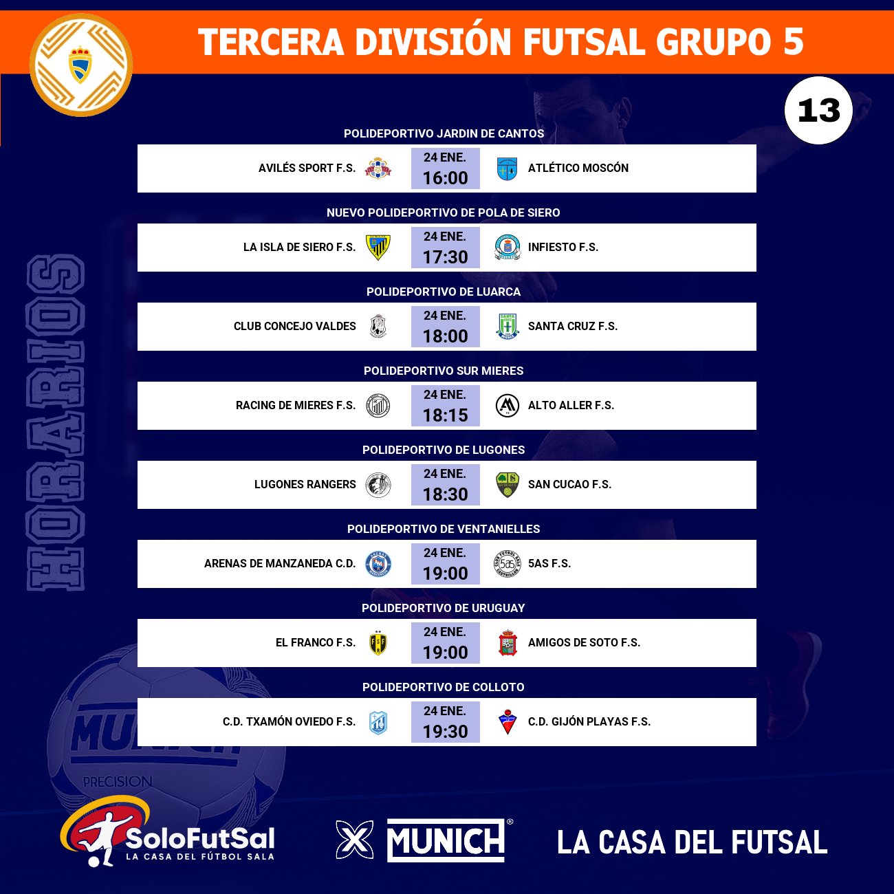La Tercera División de Fútbol Sala (Grupo 5) afronta este sábado 24 de enero una fecha trascendental. La competición llega a su decimotercera jornada con las espadas en todo lo alto. San Cucao F.S., Racing de Mieres F.S. y Avilés Sport F.S., los tres primeros clasificados de la tabla general, tienen ante sí el reto de consolidar sus posiciones de privilegio antes del ecuador de la liga. El objetivo es triple: el campeón sube a Segunda B, el segundo clasificado accede a la Copa del Rey 25/26 y los seis primeros obtienen el preciado pase a la Copa Principado. Por abajo, la lucha es igualmente feroz, ya que los tres últimos caerán al infierno de la Primera AsturFutSal.