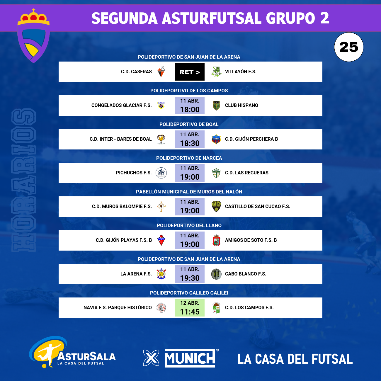 A la misma hora (19:00), el Pabellón Municipal de Muros del Nalón será testigo del enfrentamiento entre el C.D. Muros Balompie F.S. y el Castillo de San Cucao F.S. Los visitantes llegan en la séptima posición con 37 puntos, buscando reencontrarse con la regularidad para dar caza al Navia en la tabla. Su experiencia en la categoría les hace partir con una ligera vitola de favoritos, pero saben que no pueden confiarse.