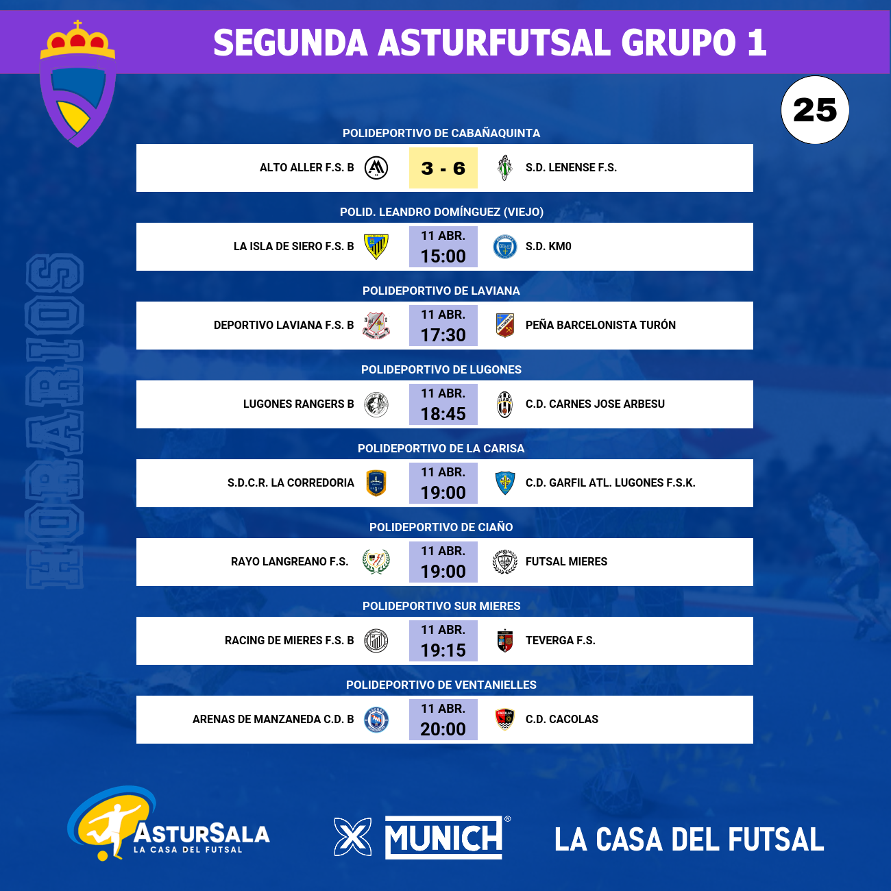 La vigesimoquinta jornada del Grupo 1 de la Segunda AsturFutSal ya ha comenzado a rodar, abriendo el telón este mismo jueves con un vibrante duelo en el Polideportivo de Cabañaquinta. En este anticipo, el S.D. Lenense F.S. impuso su autoridad a domicilio venciendo por 3-6 al Alto Aller F.S. B. Este resultado permite a los de Pola de Lena escalar momentáneamente en la tabla, alcanzando los 37 puntos y confirmando su solidez en la zona media-alta, mientras que el filial allerano se mantiene con 30 unidades, obligado a reponer fuerzas para los próximos compromisos. Con este primer resultado ya escrito, la atención se centra ahora en la frenética tarde del sábado, donde la batalla por el ascenso vivirá episodios de altísima intensidad.