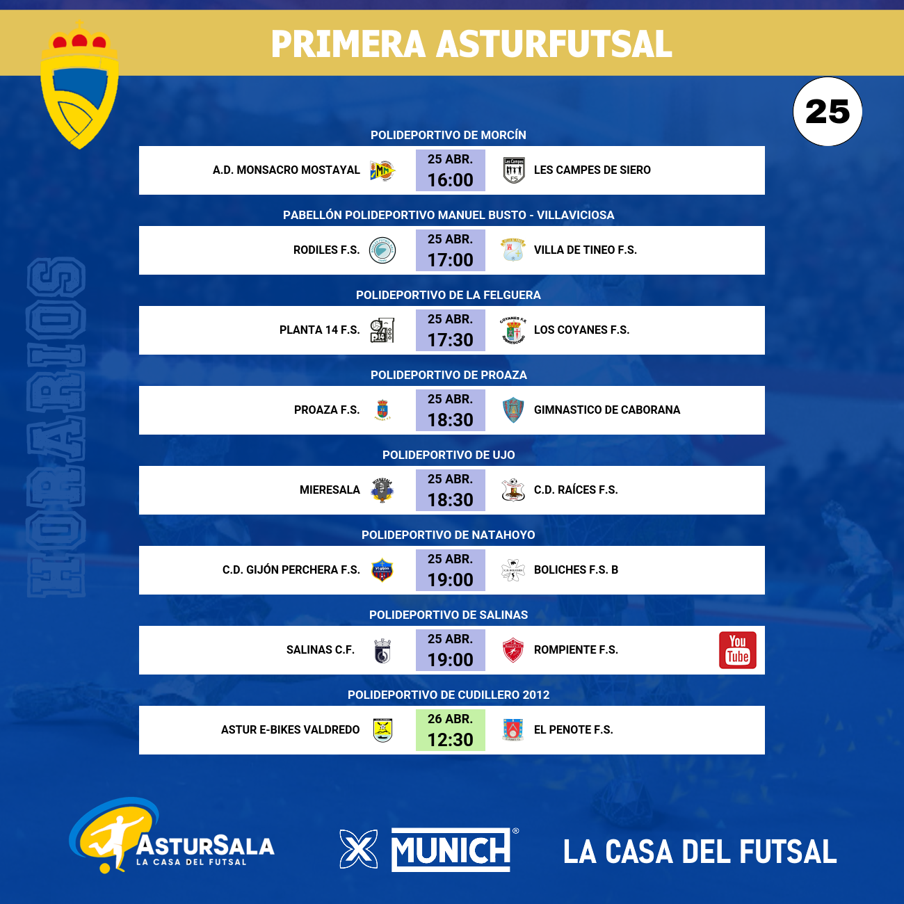 El equipo que defiende esa ansiada quinta plaza, el C.D. Gijón Perchera F.S. (40 puntos), tendrá un exigente compromiso en el Natahoyo ante el Boliches F.S. Los gijoneses han cimentado su buena campaña en la solidez como locales y buscarán afianzarse en la zona de Copa ante un Boliches que, con 31 puntos, siempre es un rival imprevisible y dinámico. Finalmente, el Gimnástico de Caborana (séptimo, 39 puntos) visitará al Proaza F.S. en un choque donde los visitantes quieren meterse de lleno en el top 5, mientras que el Proaza (undécimo, 26 puntos) intentará sumar para alejarse definitivamente de los fantasmas del descenso y respirar con tranquilidad en el epílogo del campeonato.