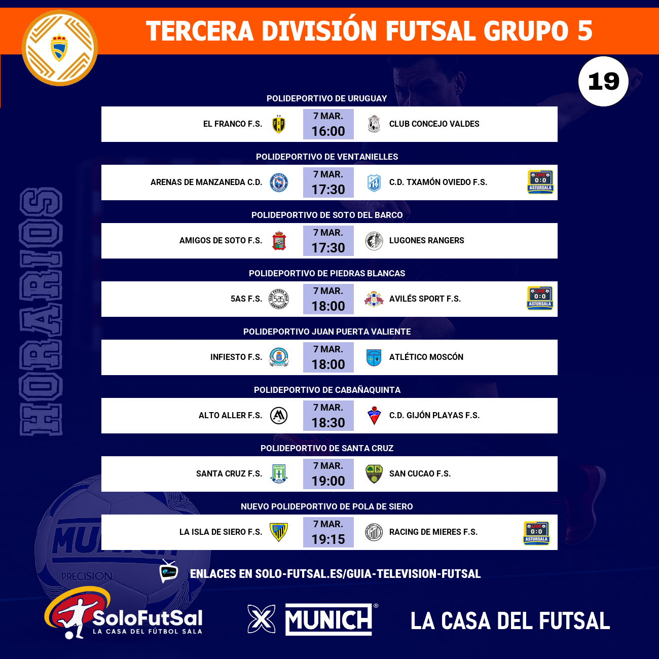 Muy atento a este encuentro estará el Racing de Mieres F.S., segundo clasificado con 44 puntos, que saltará a la pista del Nuevo Polideportivo de Pola de Siero a las 19:15 horas para enfrentarse a La Isla de Siero F.S.. El cuadro mierense no cede un milímetro en su persecución y, al igual que el líder, ha firmado un inmaculado cinco de cinco en victorias recientes.
